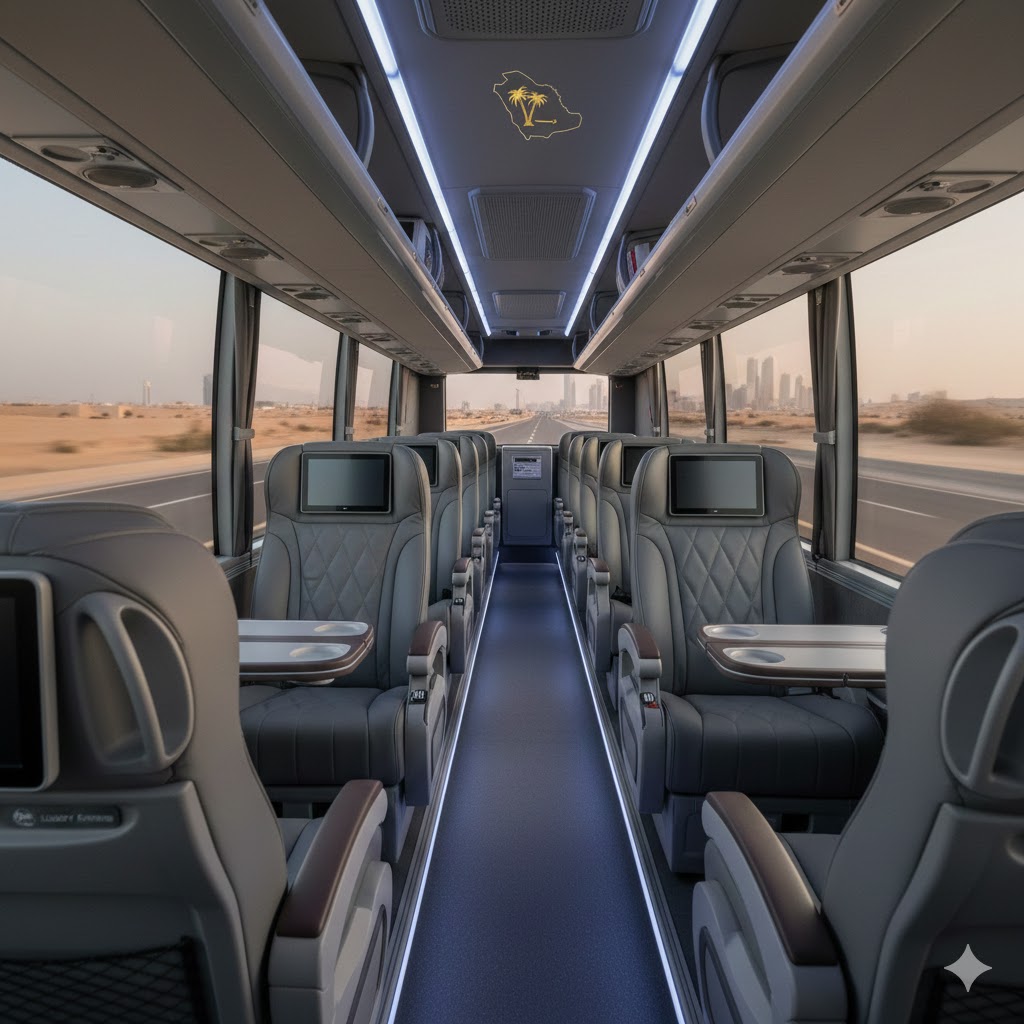 أسطول حديث ومتطور: نسير رحلاتنا عبر أحدث البولمانات (VIP) المجهزة بمقاعد مريحة (طيران)، مكيفة بالكامل، ومزودة بشاشات ترفيه وخدمات ضيافة طوال الطريق.
